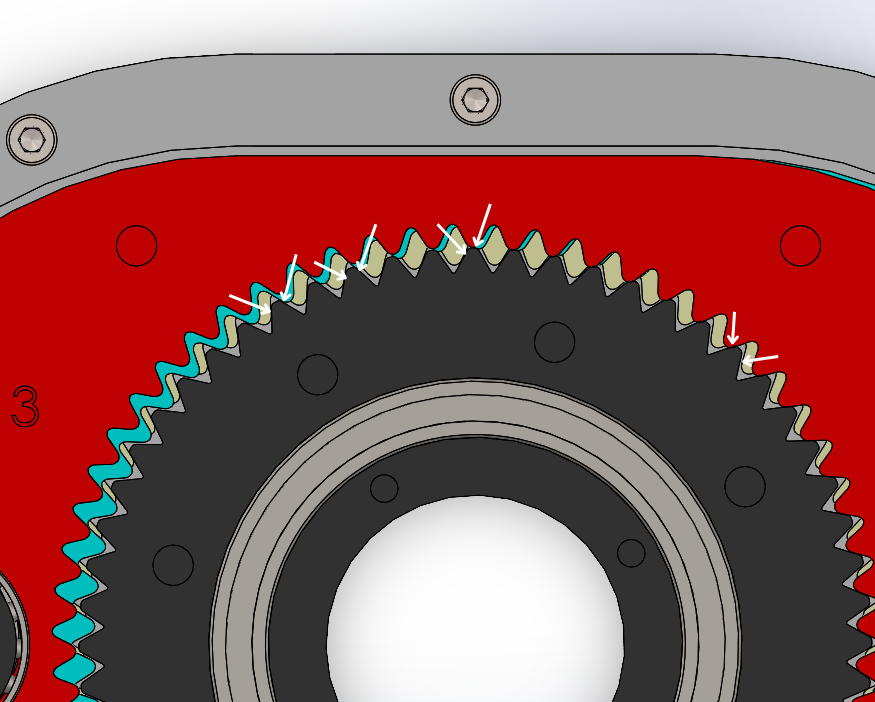 I redesigned the tooth profile to promote smoother rolling contact and maintain continuous preload. This preload is achieved through the simultaneous engagement of the three plate teeth against the output gear teeth.