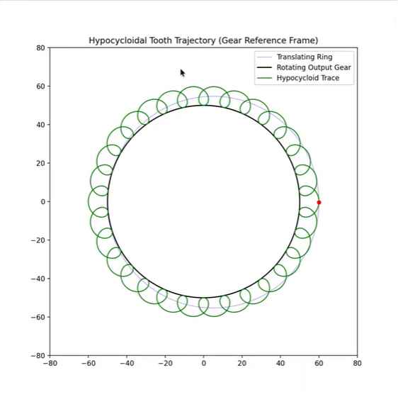 This mechanism is based on cycloidal motion, where the inner and outer discs interact through an inverted hypocycloidal-like path, as shown in the Python simulation.
