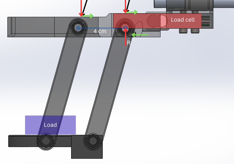 The top linkage was analyzed using a simplified free-body diagram, modeling the angled links as force-transmitting members. For a centered load and symmetric setup, the vertical force is shared between both sides, so the load cell measures roughly half of the total load: