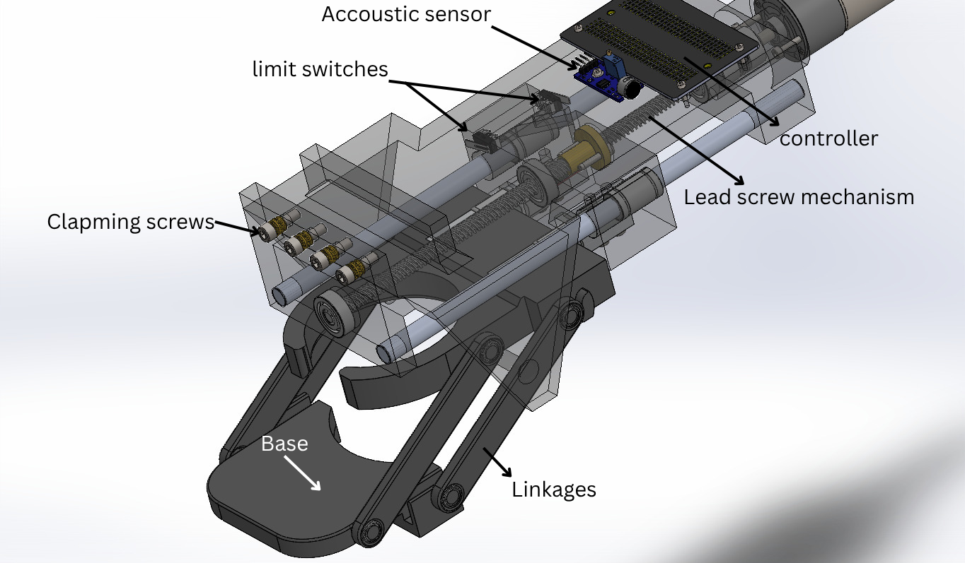 A fully functional prototype was built, integrating the four-bar linkage, lead screw actuation, and sensing system into a compact assembly. The mechanism was tested through repeated deployment cycles to evaluate consistency and reliability. Throughout testing, all sensors—including load cells, limit switches, and the acoustic module—were verified to operate seamlessly within the controller logic, enabling coordinated and responsive system behavior.