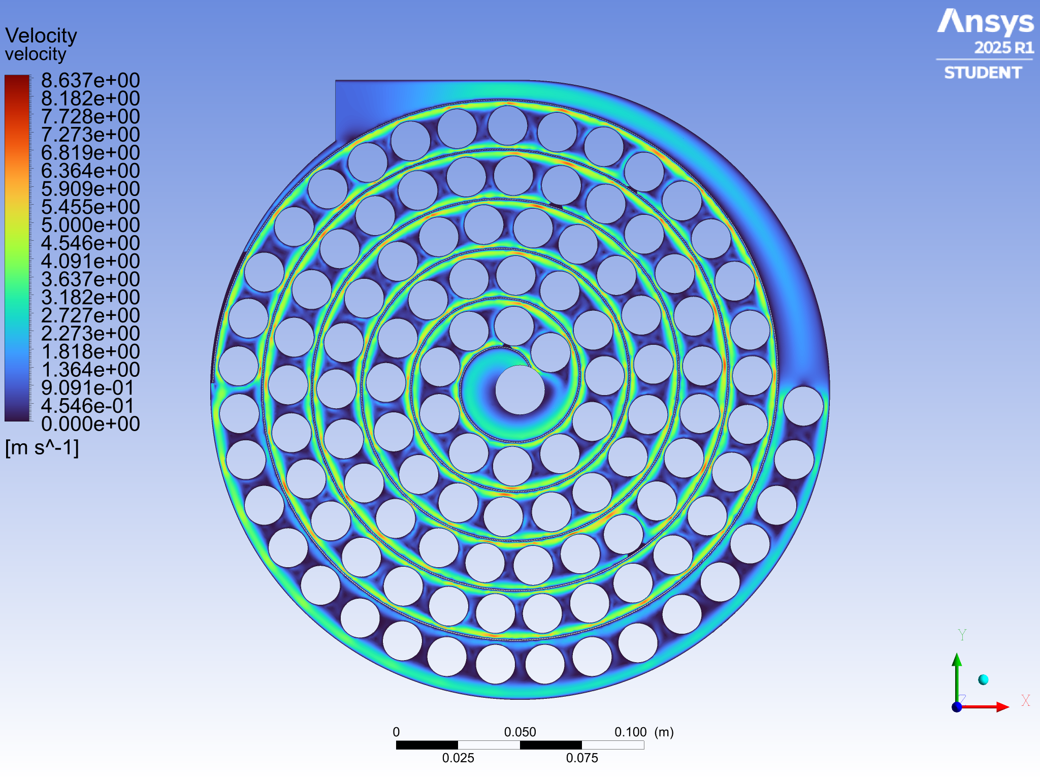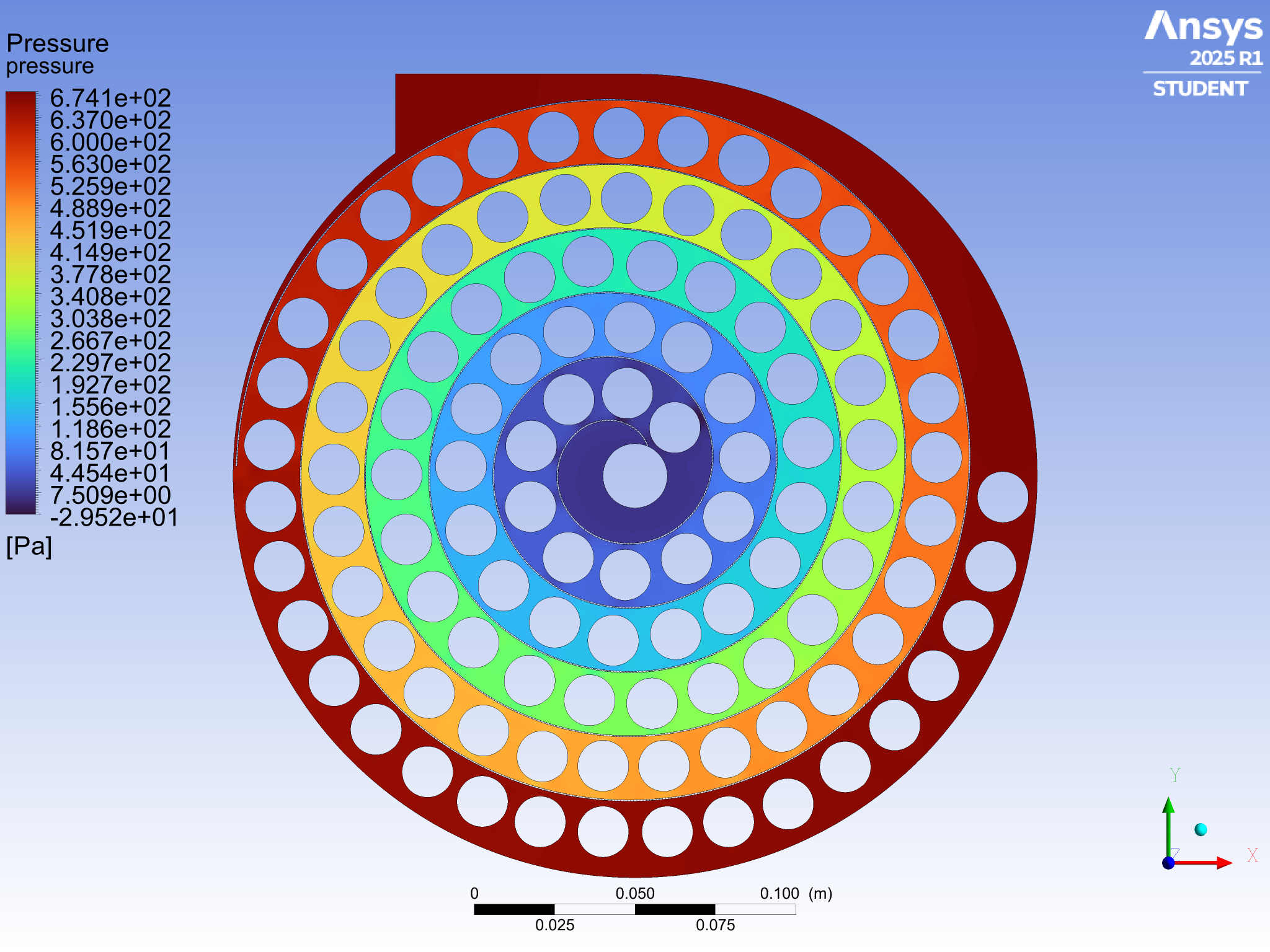 The smooth, concentric pressure contours show that the flow moves through the spiral with minimal restriction despite the curved path and embedded PCM tubes