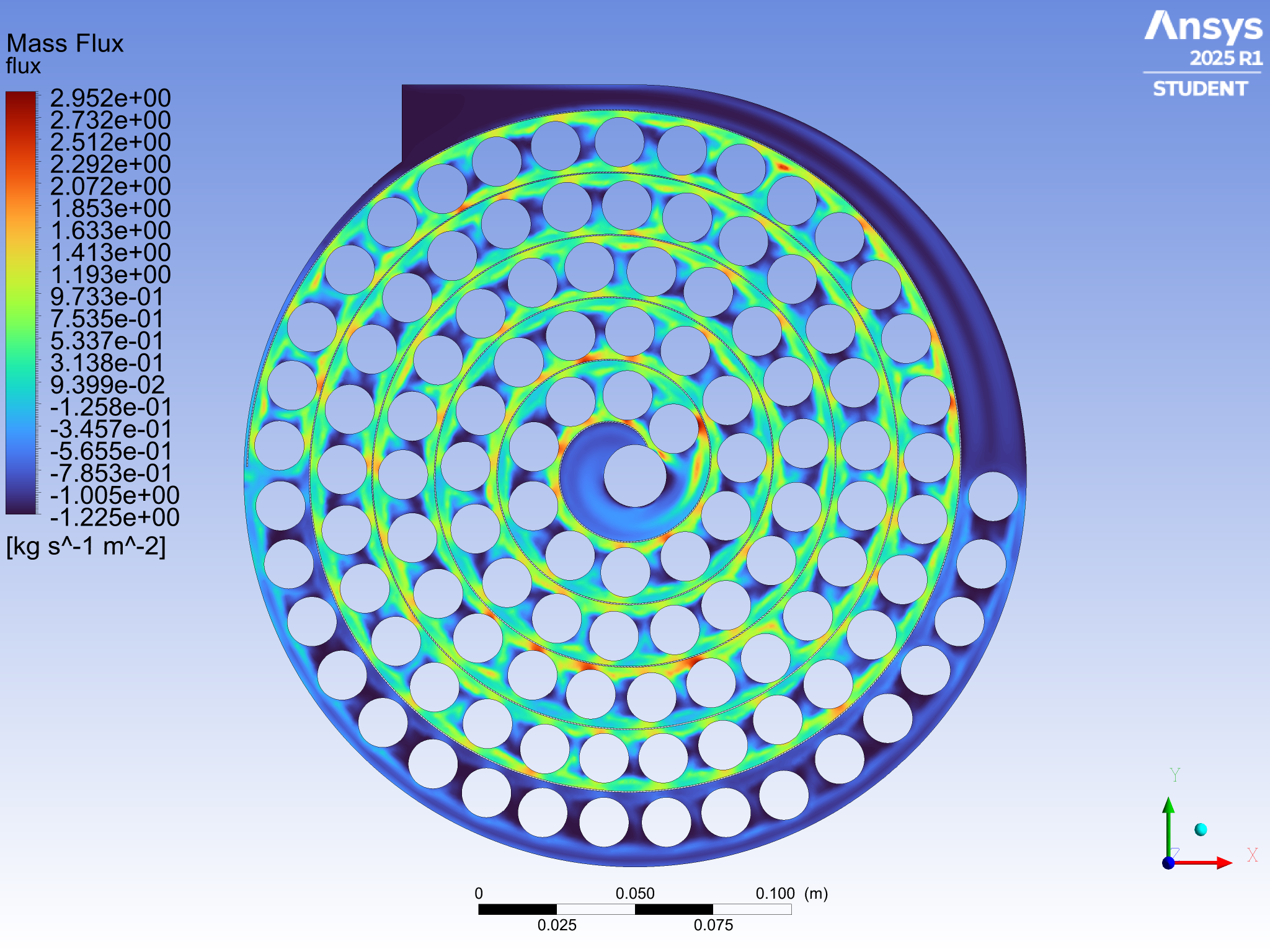 Mass flux remains relatively uniform through most of the spiral, indicating that the geometry distributes flow effectively and avoids major bypassing between PCM capsules.