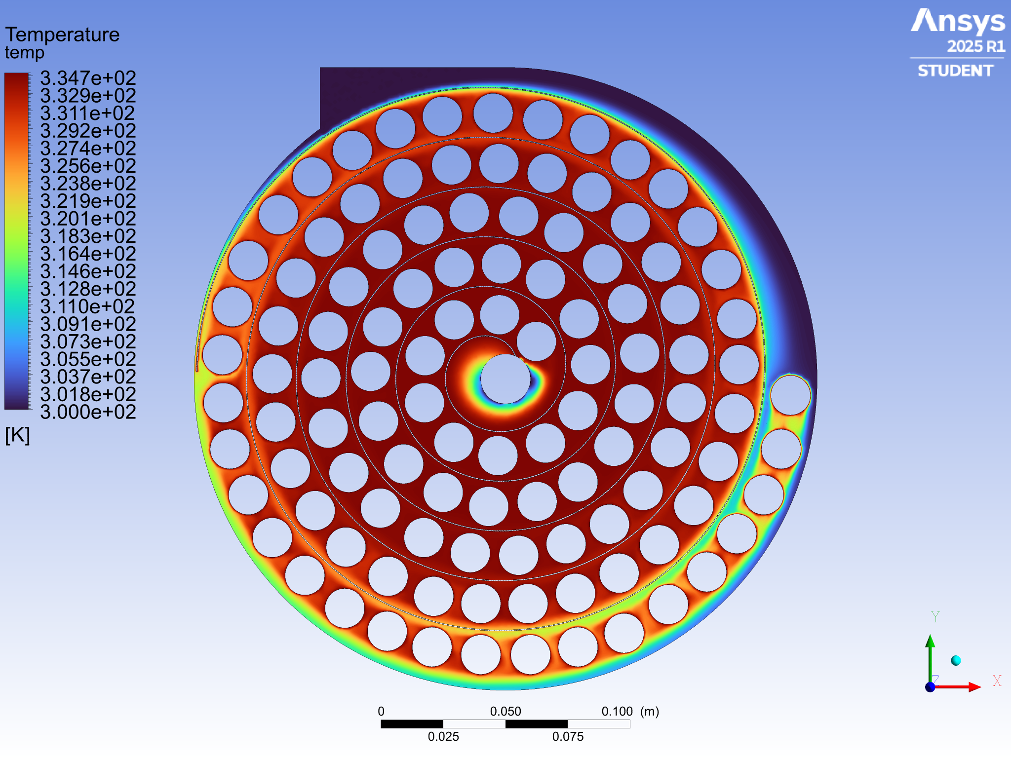 The central outlet region also shows a localized temperature drop, likely caused by increased velocity and reduced residence time near the outlet.